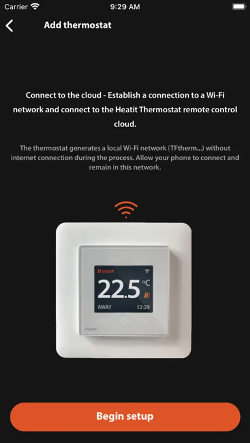 Thermostats can be easily added to application by setting thermostat into “Connect to cloud” mode. Thermostat will show two three digit PIN codes, which are entered into application in “Add thermostat”. WIFI network selection and password entering is done in application.