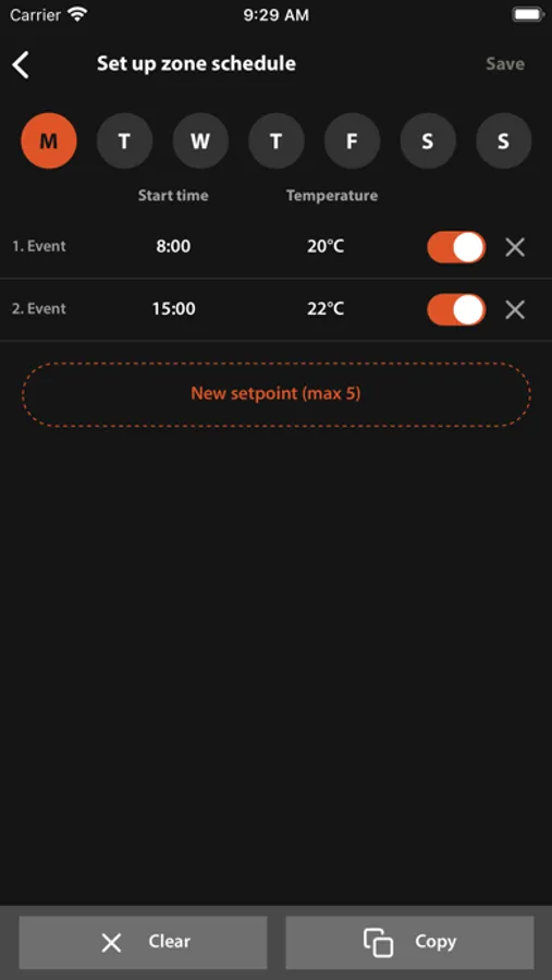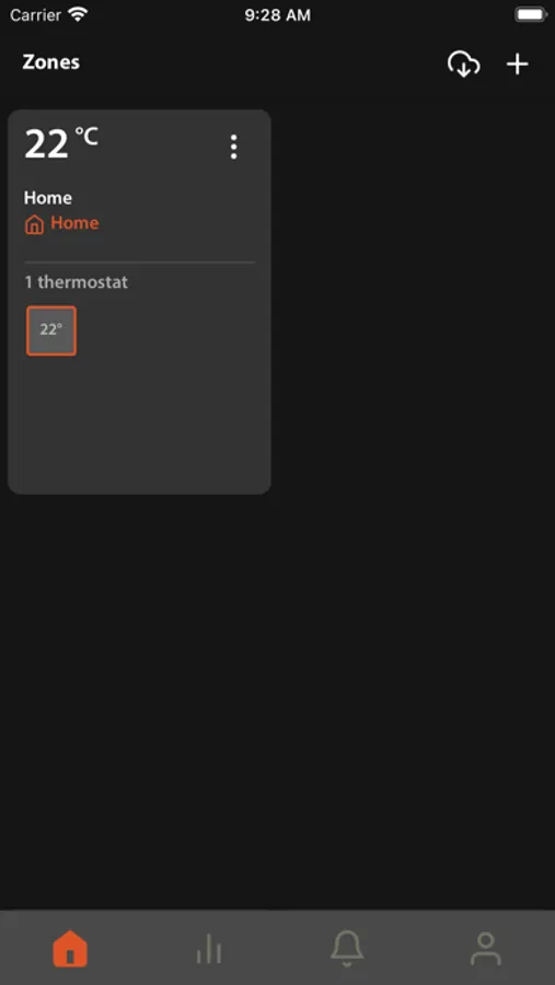 Multiple thermostats can be controlled from the application. Thermostats can be grouped into zones enabling common setpoint & mode selection for several thermostats. Thermostat can be also placed into custom control mode to override zone settings.