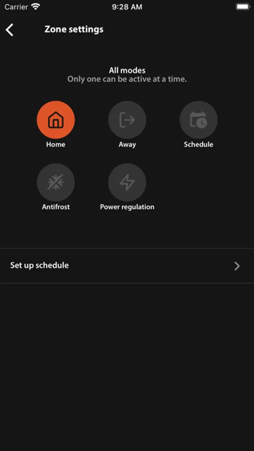 Application offers fast switching between Home, Away and Schedule modes, additionally Anti-frost and Power regulation modes are available. Weekly Schedule can be easily programmed with application.