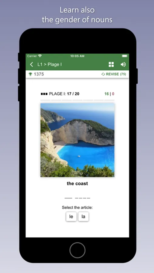 - The gender of the noun will also appear, so that you will learn directly the correct article to each noun. The plural form of each noun will also be displayed.