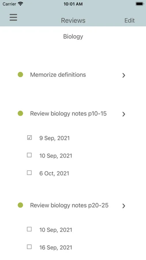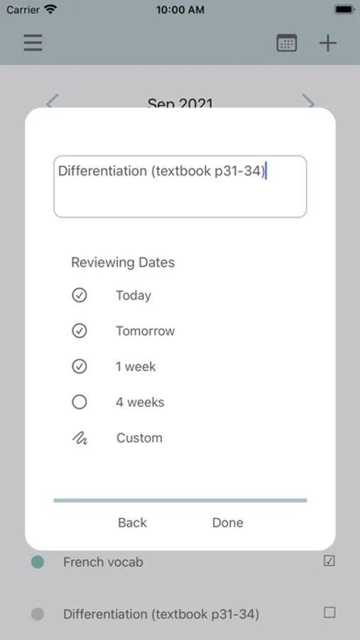 Regularly reviewing information is essential for transforming short-term memories into long-term memories. This app will help you keep track of your reviewing dates in order to study efficiently and effectively.