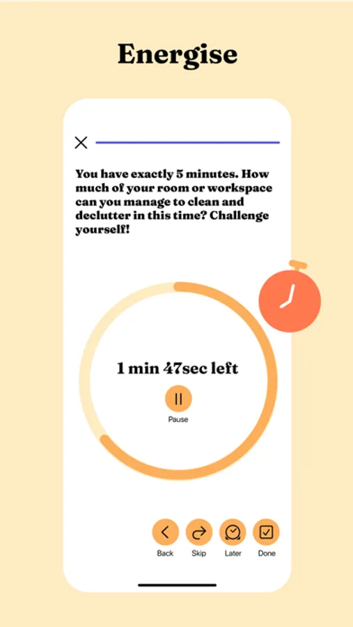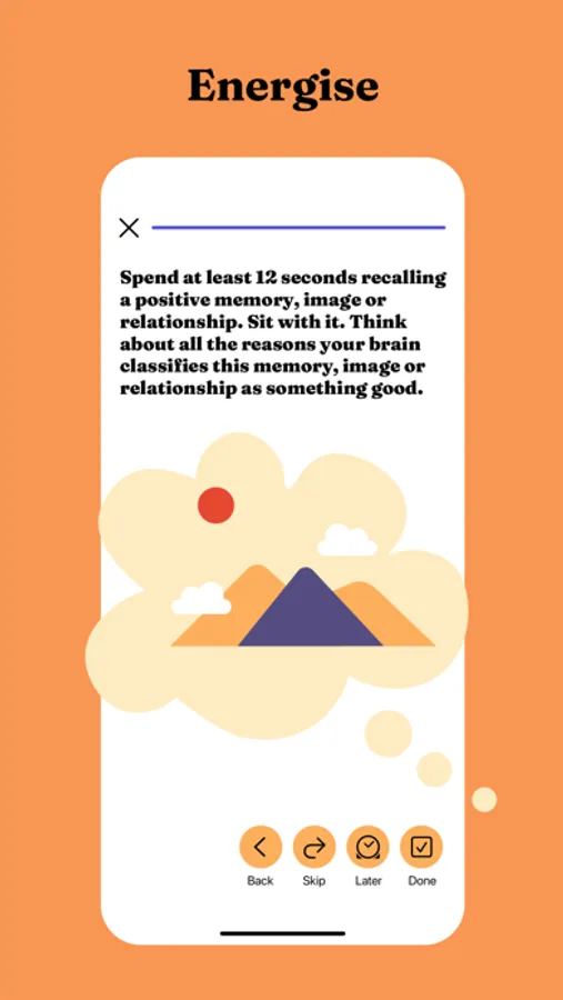 Another type of content you might get after your daily mood log is a physical task to complete. Sometimes all you need to cheer up is to go for a walk, get your heart pumping with some exercise or simply smile for 12 seconds! A task can be skipped or scheduled for later if you don't have time to complete it right away. You will see a list of opened tasks on your home screen if there are any.