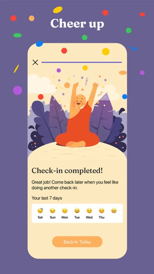 Every day you can do a mood "check-in" - pick one of 8 mood categories that best describes your inner state at the moment. Daily check-ins are not limited, so feel free to do them multiple times if your mood changes a lot throughout the day. Generally, we recommend logging your mood at least twice a day - in the morning and in the evening.