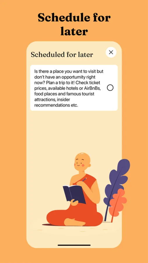 Based on the mood you picked you will be suggested tailored content of several types, one of them being questions, thoughts, and quotes to reflect on. For example, you might be asked to remember your happiest childhood memory or write down a positive affirmation to yourself. Another time you might need to brainstorm silly solutions to the problem that's worrying you at the moment. In a way, daily reflection is a kind of self-therapy as it raises questions important for your happiness, self-motivation, and emotional health.