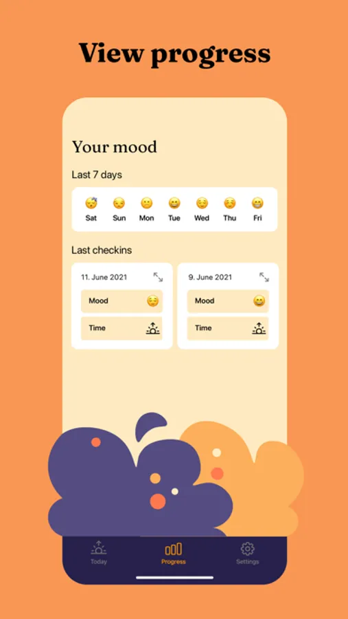 All your mood logs are saved in the progress tab, as well as your answers to reflective exercises and all completed tasks. Progress view is important to analyze how your mood is developing throughout the day and the week and determine a trend. Remember, that although mood swings are widely common and normal for most people, being in low moods for longer periods of time can indicate depression and be a symptom of mood and other mental disorders! Please consult with a medical professional if you feel like you are frequently experiencing severe mood swings and low moods.