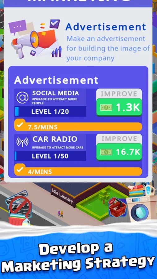You start with a washing room and then build a drying room, then an ironing room, dry-cleaning room, etc. Buy new machines and improve them. You can also decorate the rooms by buying furniture and goods.