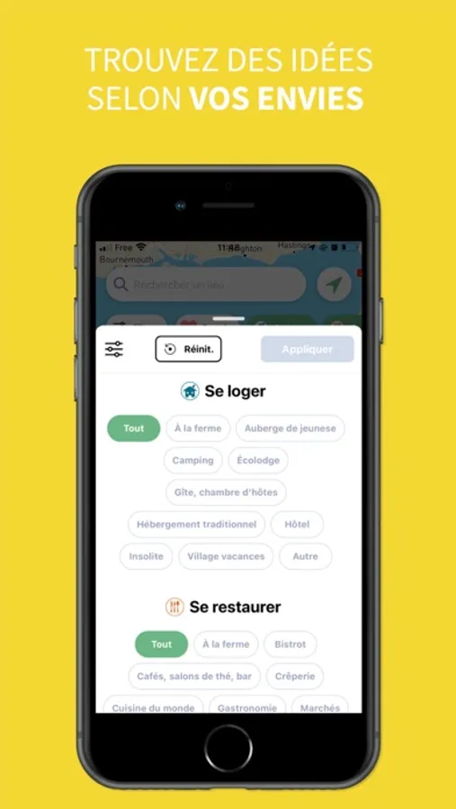 • choisir les adresses qui vous intéressent grâce à des filtres thématiques (accès famille, accès vélo, accès handicap, niveau de prix…) et des filtres correspondant aux catégories d'adresses recherchées (hébergement, camping, hôtel, restaurant bio, végétarien ou vegan...)