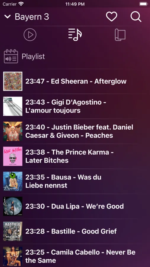 Beim Hören kannst du anschauen welcher Song gerade im ausgewählten Radio läuft. Außerdem kannst du das zugehörige Coverbild anschauen und die vergangenen Songs suchen, die wir vor einem Monat