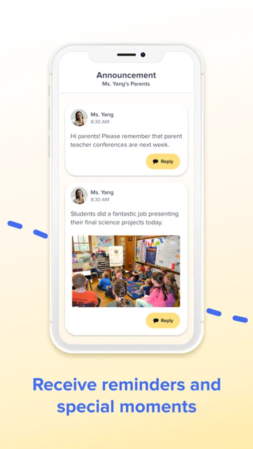 - Classroom announcements. You and fellow parents receive reminders, announcements, and special moments sent from your child's teacher.