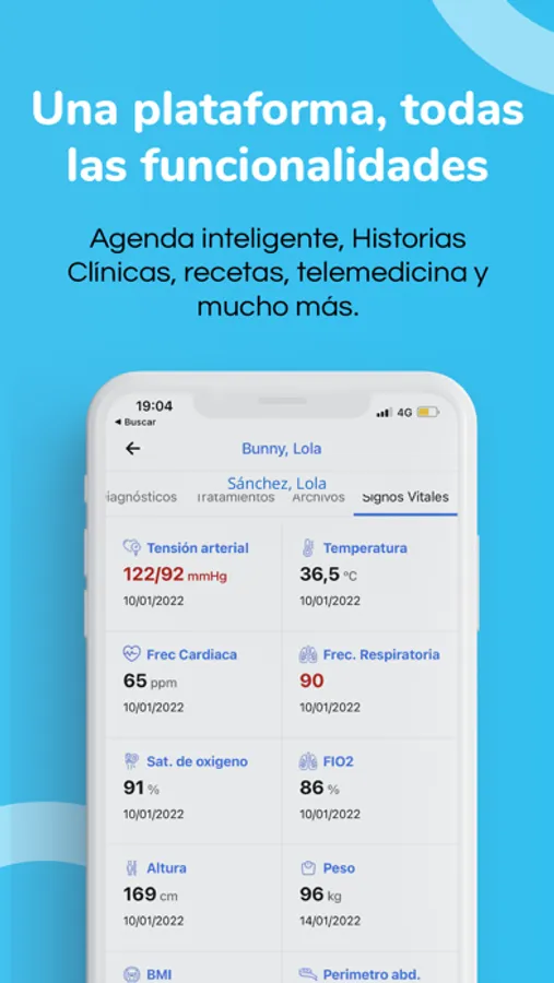 Centraliza la información de tus pacientes de forma segura y eficientiza los tiempos de consulta. Carga diagnósticos y tratamientos, detectando de forma automática posibles interacciones medicamentosas, visualiza fácilmente valores fuera del rango normal y adjunta todos los archivos, imágenes o estudios que necesites en el historial de tu paciente.
