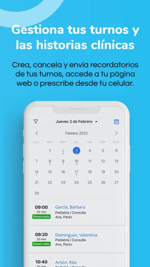 Ahorra el tiempo de tu asistente y el de tus pacientes con la agenda más poderosa del mercado. A través de una agenda colaborativa con el personal administrativo, envía recordatorios automáticos a pacientes y profesionales y crea tu página web de turnos online con reglas personalizadas.