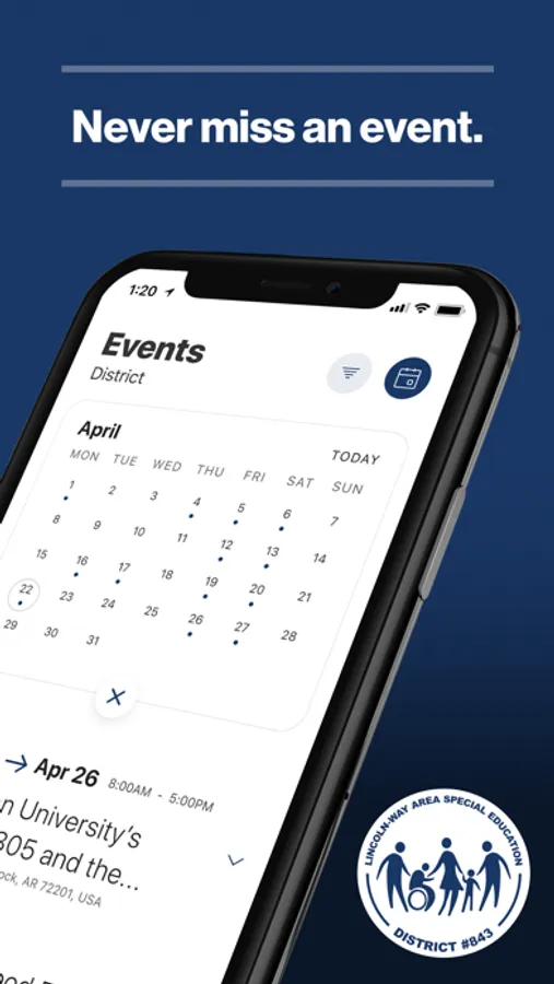 The event section shows a list of events throughout the district. Users can add an event to their calendar to share the event with friends and family with one tap.