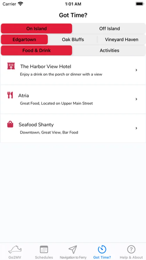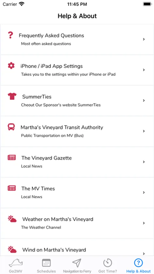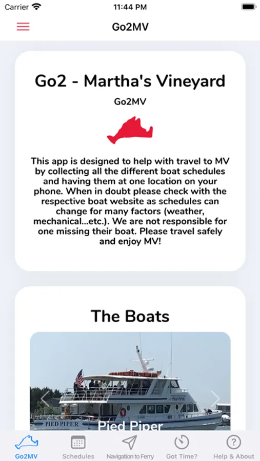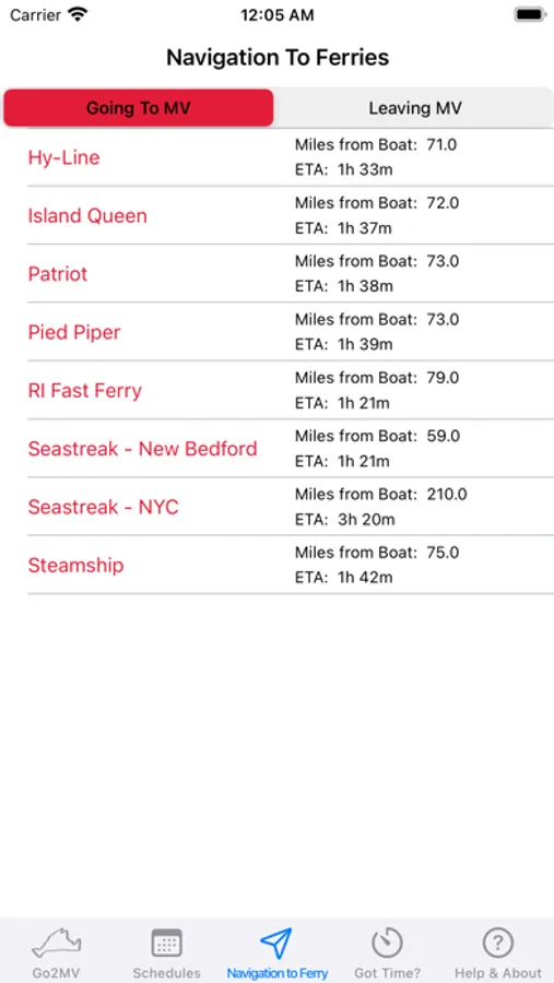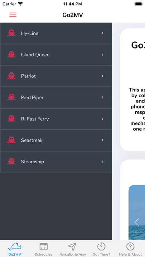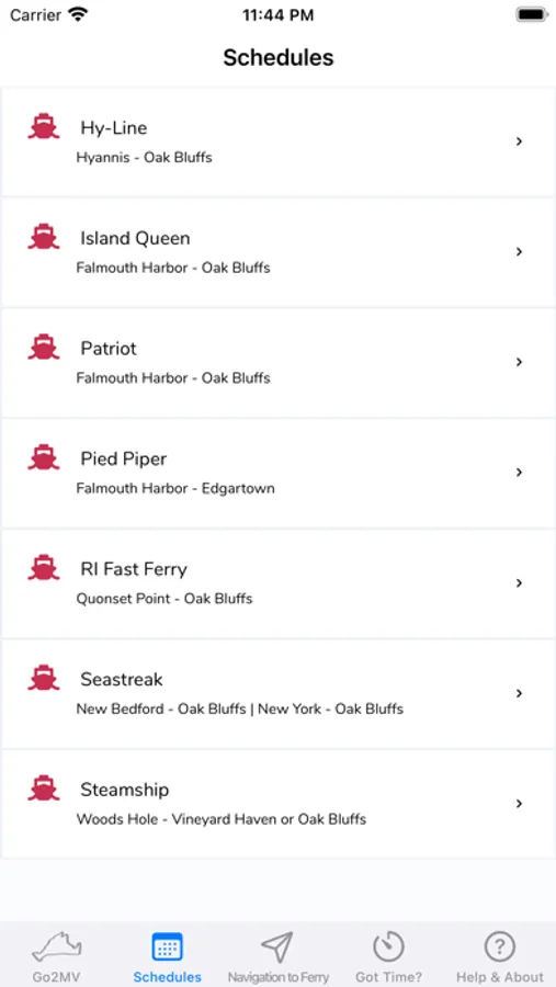 This app contains both schedule aggregation and GPS navigation for getting to Martha's Vineyard. Currently the app includes schedules and GPS locations for the Hy-Line, Island Queen, Patriot, Pied Piper, RI Fast Ferry, Seastreak, and Steamship ferry lines.