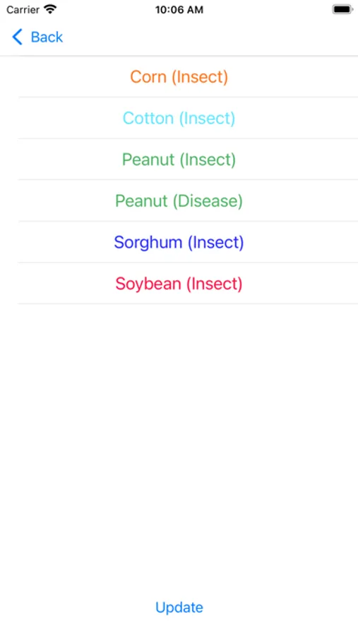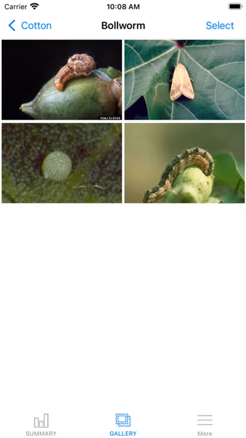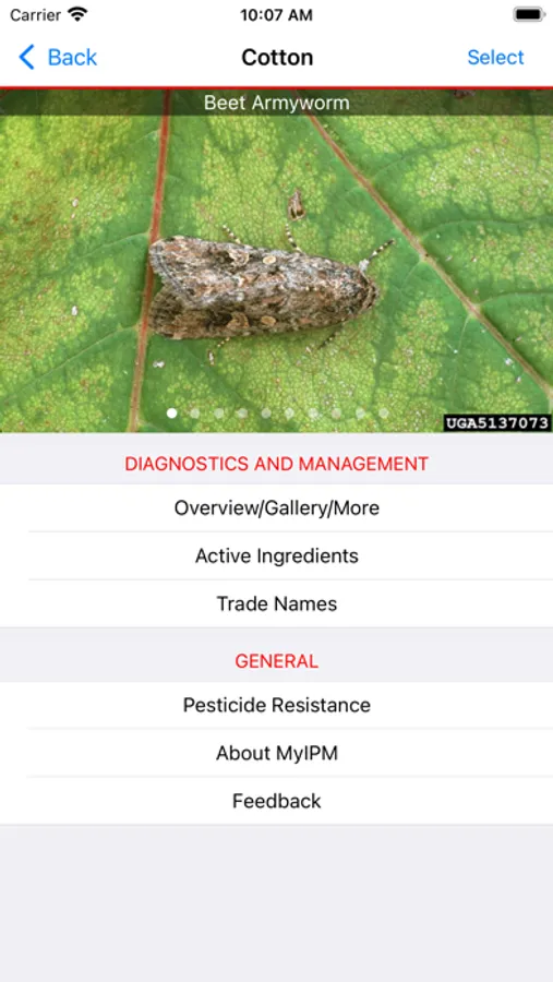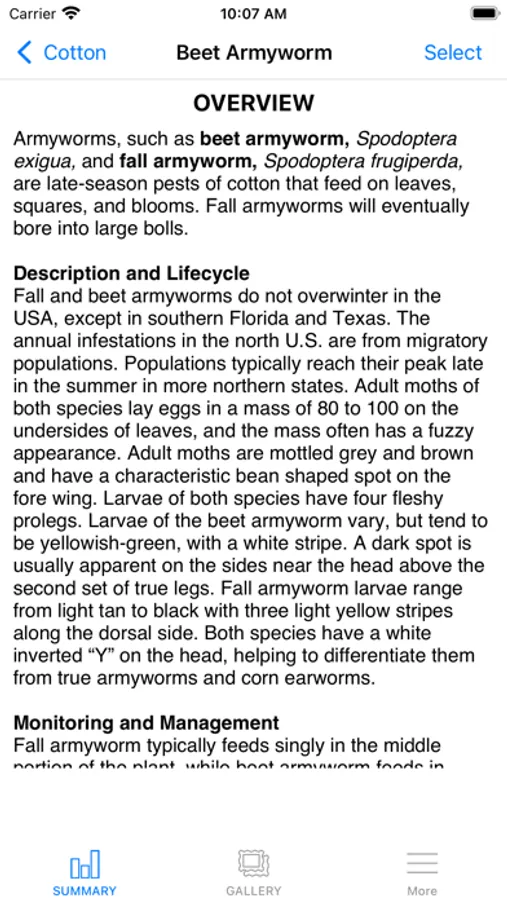 The home screen lets the user choose the fruit and discipline (pest or disease) and lets the user update data from the external database. The user can go back to this screen at any time and add or delete a selection. On top of this screen is a search bar that lets the user search active ingredients and trade names. Results will list the crop the product is registered for, the rate per acre and the efficacy rating. Then the user chooses one of the crop and discipline choices. The user taps a crop which opens up the disease or pest page. On any disease page the user can choose a disease by clicking the picture or choosing Overview/Gallery/More to learn more about it. Disease-specific information includes an overview about the disease and its management and a short, 2 to 3 min audio from the regional expert on the bottom of the page. The GALLERY features 6 pictures of disease signs and symptoms and pictures illustrating management solutions. The user can zoom in each picture. In the MORE section, the user finds information about the disease and its causal organism (including disease cycle and symptoms and signs), chemical control information, fungicide resistance information, and non-chemical control information (including biological control options, cultural control options, and resistant varieties). The same features can be pulled up for any pest.