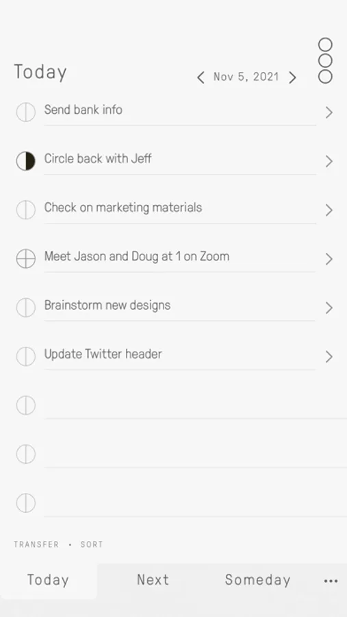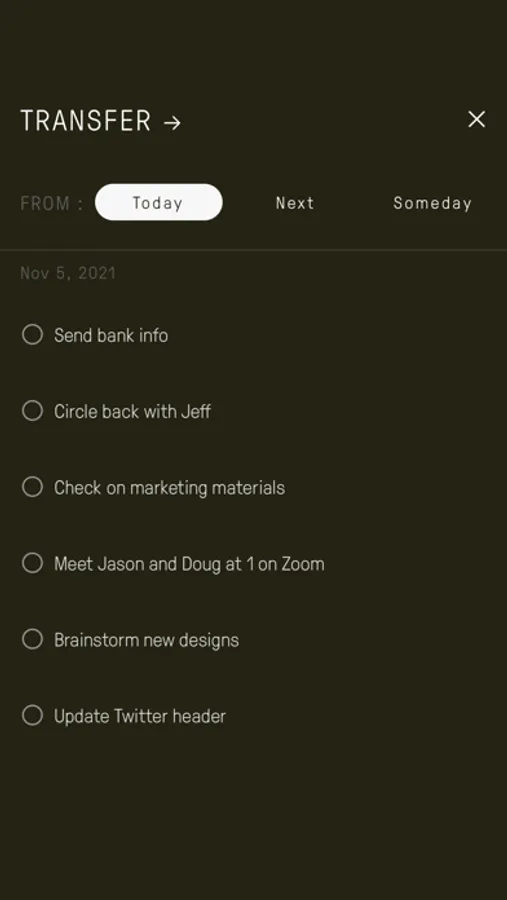 Track tasks on digital cards for Today, Next and Someday. Easily transfer unfinished tasks to Today's card.