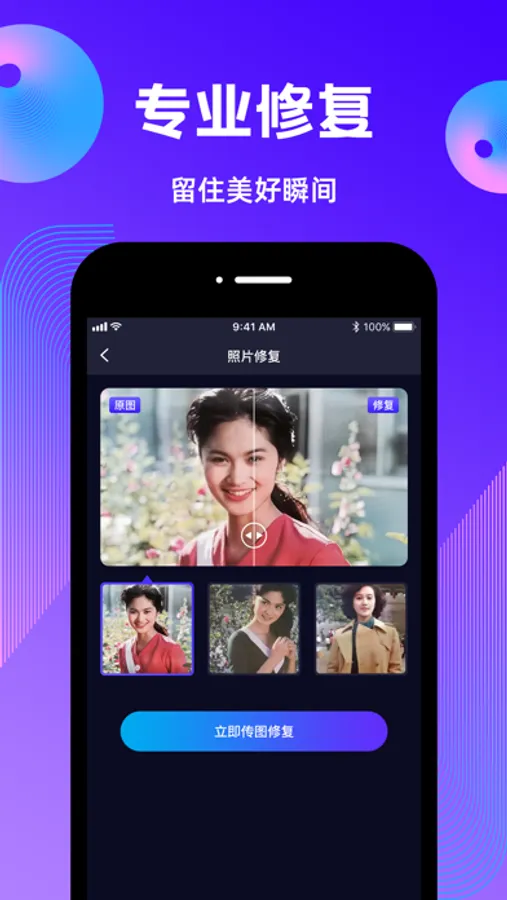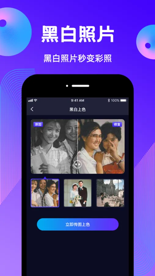 利用先进的AI技术,实现照片的修复以及黑白上色特效,制作属于您的怀旧照片视频。