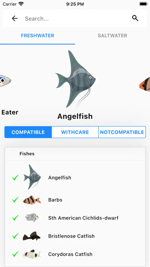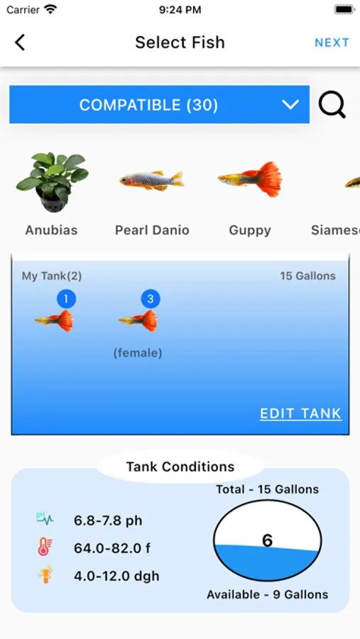 Aquabuildr has a simple interface where you can select any beautiful fish to get started and our compatibility intelligence will guide , how many fishes , which fishes, male or female you can add to tank. You can vary your tank size from 30 to 180 gallons. Tank will show warning if the space is not sufficient for new fish.