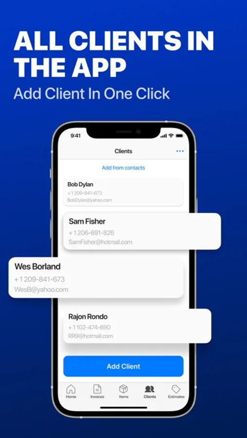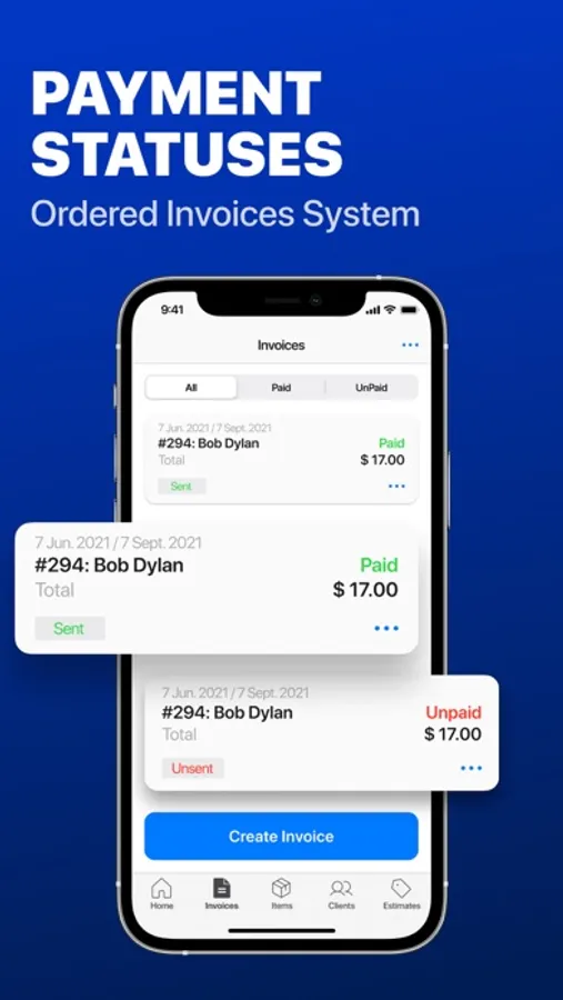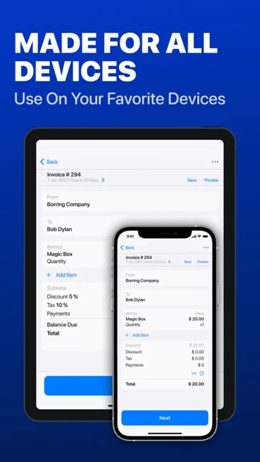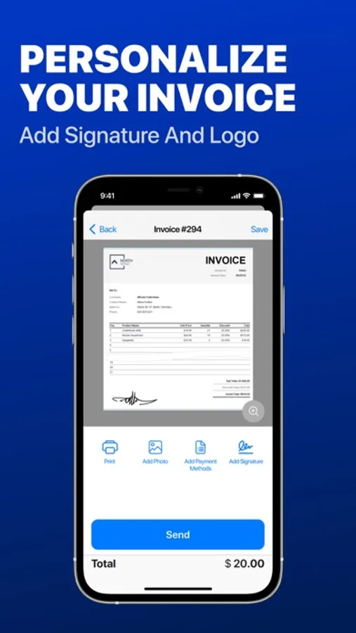 Create invoices, estimates, quotes, or receipts. Add your logo and signature, save unlimited items and customers, use premade templates, track invoice statuses, get business reports. Save, print, or send an invoice by email. Track your payments on the go. All your data is securely saved and synchronized across all your devices.