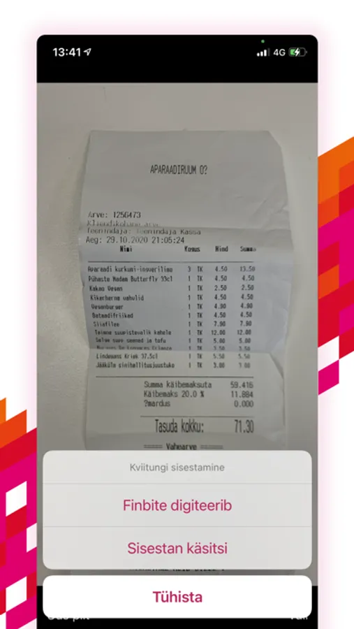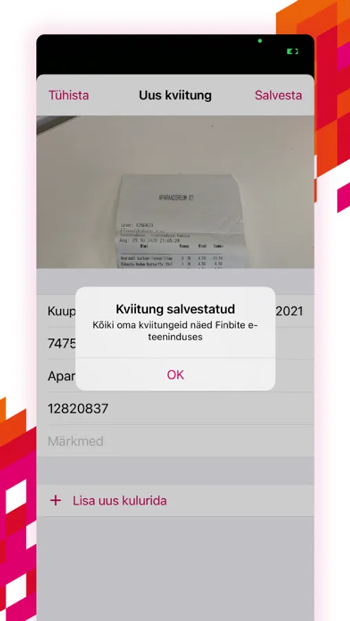 Selle jaoks pildista nutitelefoniga ostutšekki, lisa äpis tšeki andmed ning hetkega jõuab see Finbite süsteemi, kus sellele saab lisada kinnitusringi ja saata summa tagasimaksmisele.