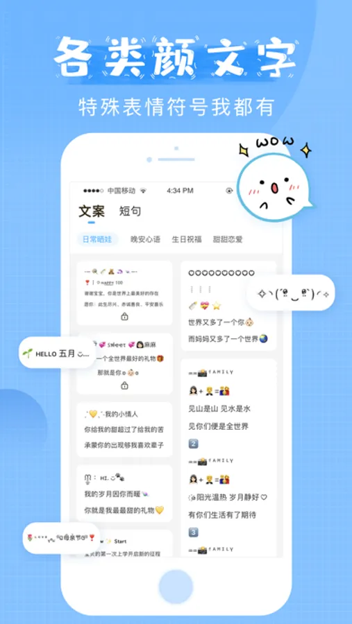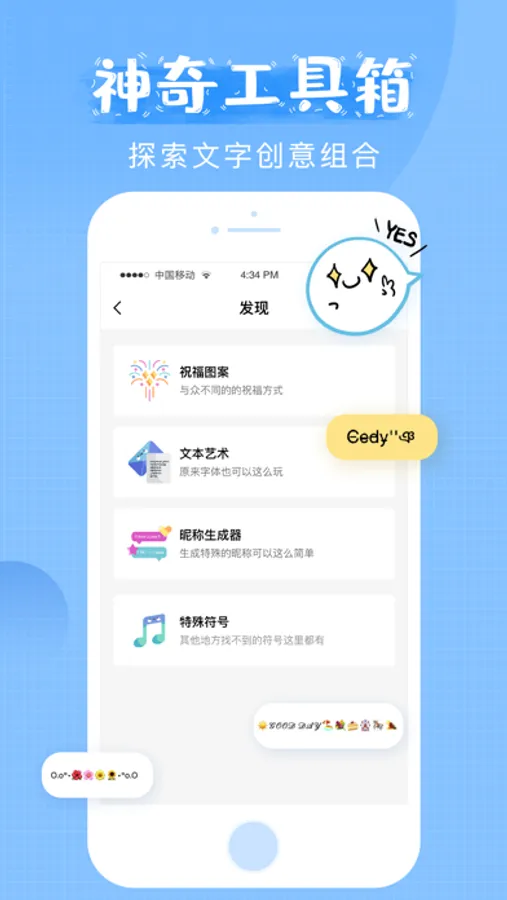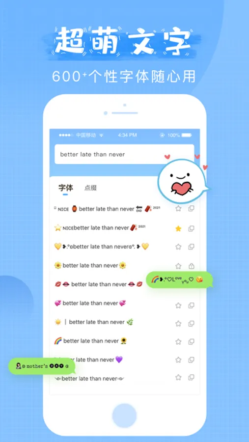 助你轻松玩转微信,小红书,抖音等社交平台。提供了丰富的创意字体,文字装饰,特殊符号,颜文字表情等。更有朋友圈热门文案模板,短语金句,情感祝福,社交平台上你就是最靓的崽。