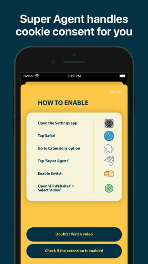 Super Agent automatically fills out website’s cookie consent forms for you based on your preferences.