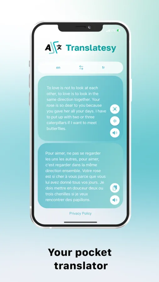 Translatesy provides the most accurate translation and helps you travel seamlessly or learn new languages every day. Translate text, voice, camera photos, screenshots or dialogues with ease.