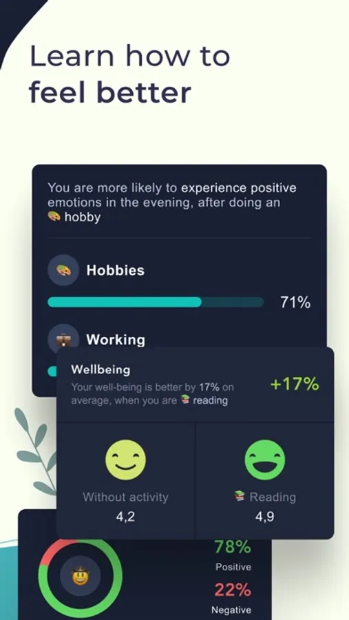 Keep track of your well-being in just a few clicks every day and we'll help you understand which activities are positively or negatively affecting your physical and psychological health.