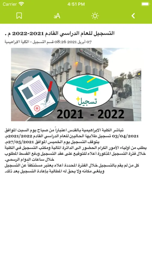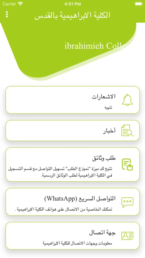 يهدف التطبيق الى تعزيز التواصل بين ادارة الكلية الابراهيمية وأولياء الأمور من جهة وبين المجتمع المقدسي من جهة أخرى ، يهدف التطبيق الى ارسال اشعارات الى أولياء الأمور أولا بأول تتضمن أخبار واعلانات الكلية ، كما يمكنكم التواصل مع الكلية من خلال طلب الوثائق المهمة وحجز مواعيد للحضور الى الكلية