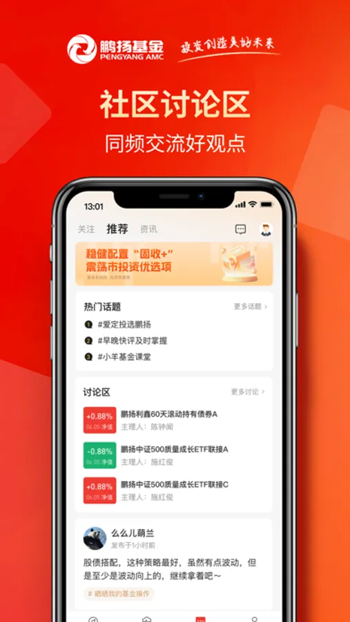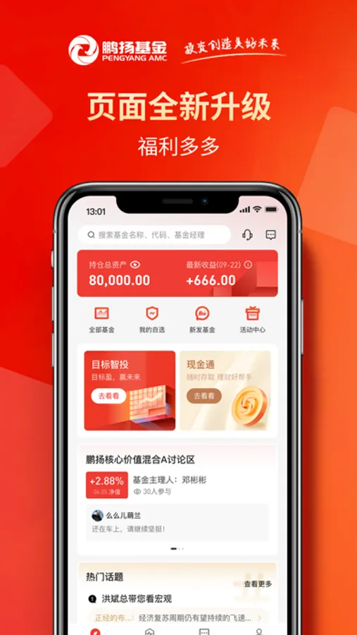 专业稳健,回报信任,欢迎使用鹏扬基金官方APP好基通!作为一款集“交易、投顾、理财”于一体的应用程序,好基通致力于为基民买基、选基和进行资产配置提供省钱、快捷、安全的工具,不仅满足了投资者购买基金的便利性,降低了购基成本,同时也将真正成为投资者的投顾伙伴,不断为广大投资者提供增值服务。鹏扬好基通APP将持续进行优化升级,致力于给客户带来优质的投资体验。