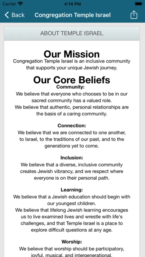 We believe that everyone who chooses to be in our sacred community has a valued role. We believe that authentic, personal relationships are the basis of a caring community. We believe that we are connected to one another, to Israel, to the traditions of our past, and to the generations yet to come.