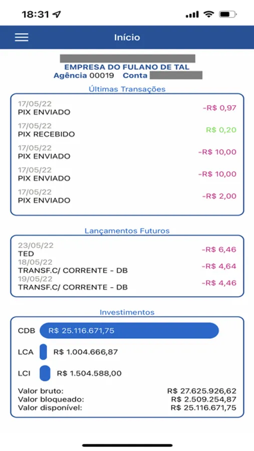 - Tela inicial contendo as suas últimas transações, lançamentos futuros e investimentos;