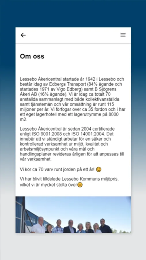 Lessebo ÅC är ett anrikt transportsäljande företag som varje år kör cirka 70 varv runt jorden samt sysselsätter omkring 70 personer. Genom appen vill vi ha ett samlat ställe för vår personal och kunder där de kan hitta nödvändig information. I appen kan man exempelvis direkt skicka en bokningsförfrågan eller leta upp aktuell information om ett fordon.