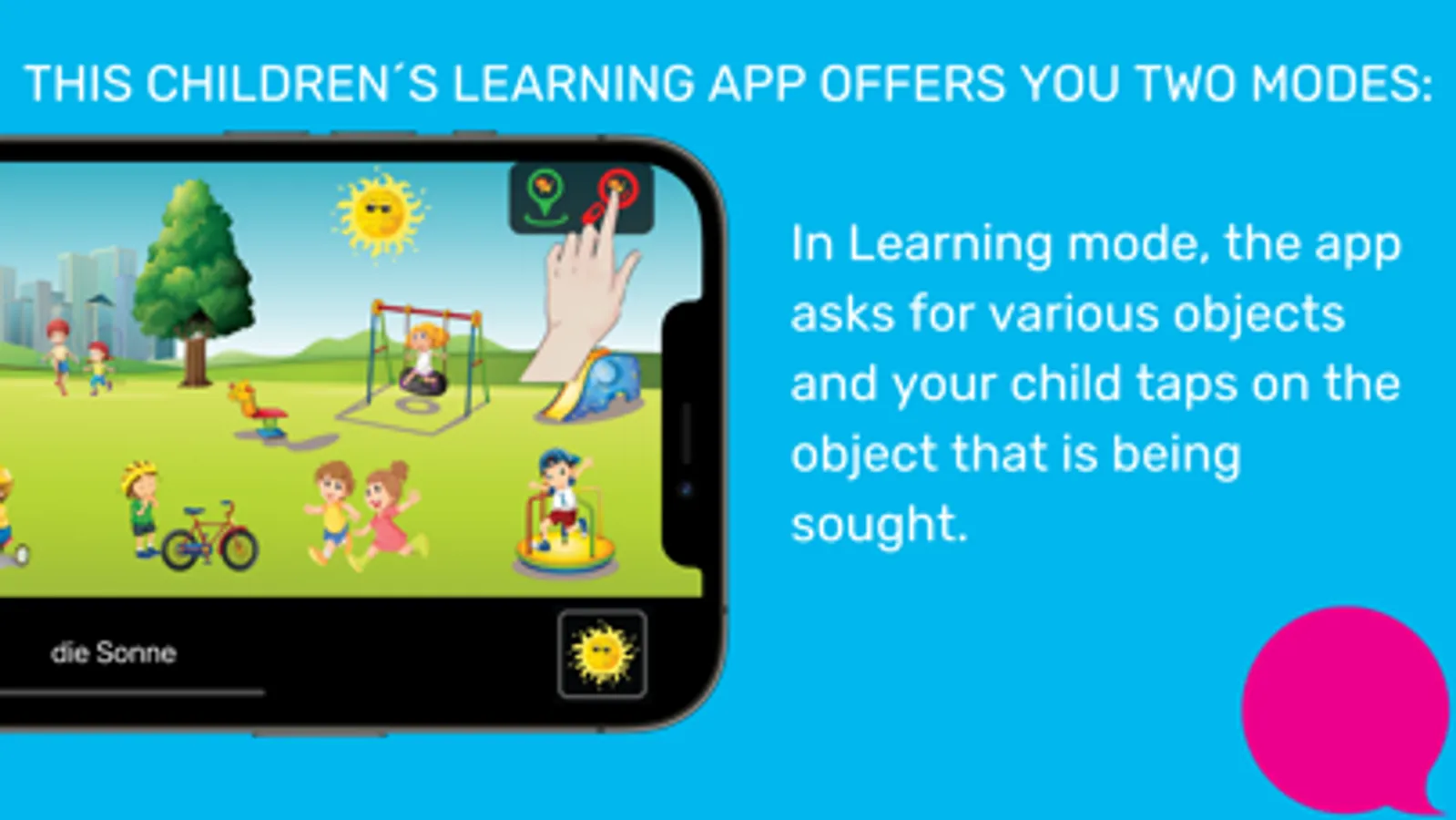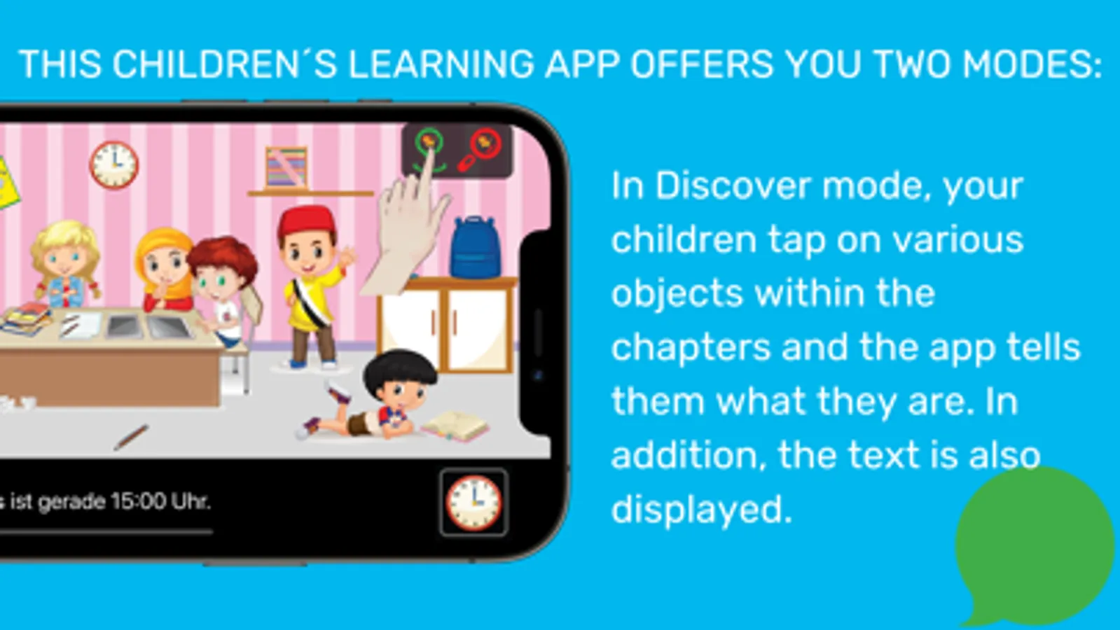 1. In Discover mode, your children tap on various objects within the chapters and the app tells them what they are. In addition, the text is also displayed. For example, if your child clicks a ball, the app says, "the ball" and the text "the ball" is displayed at the same time.
