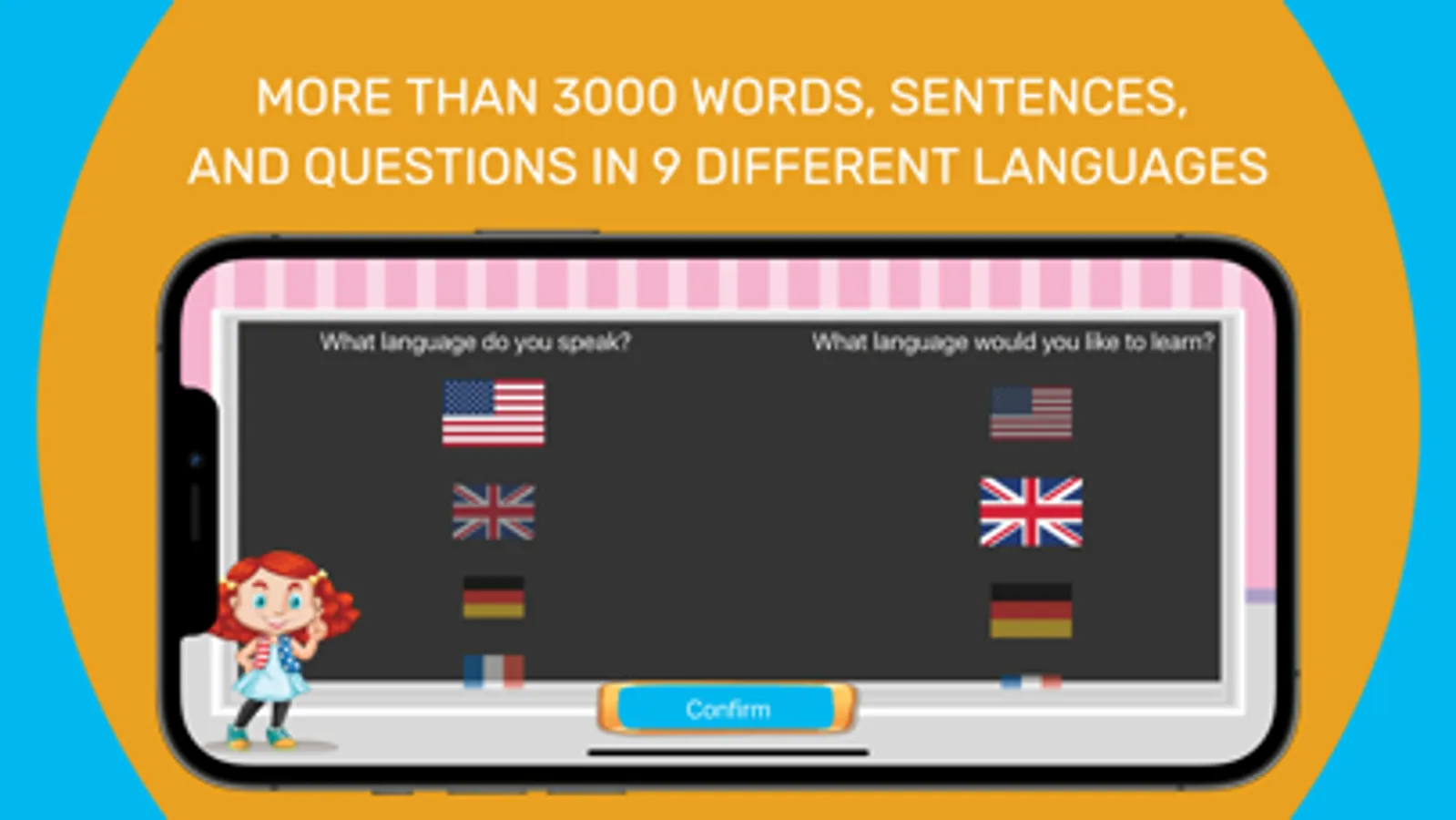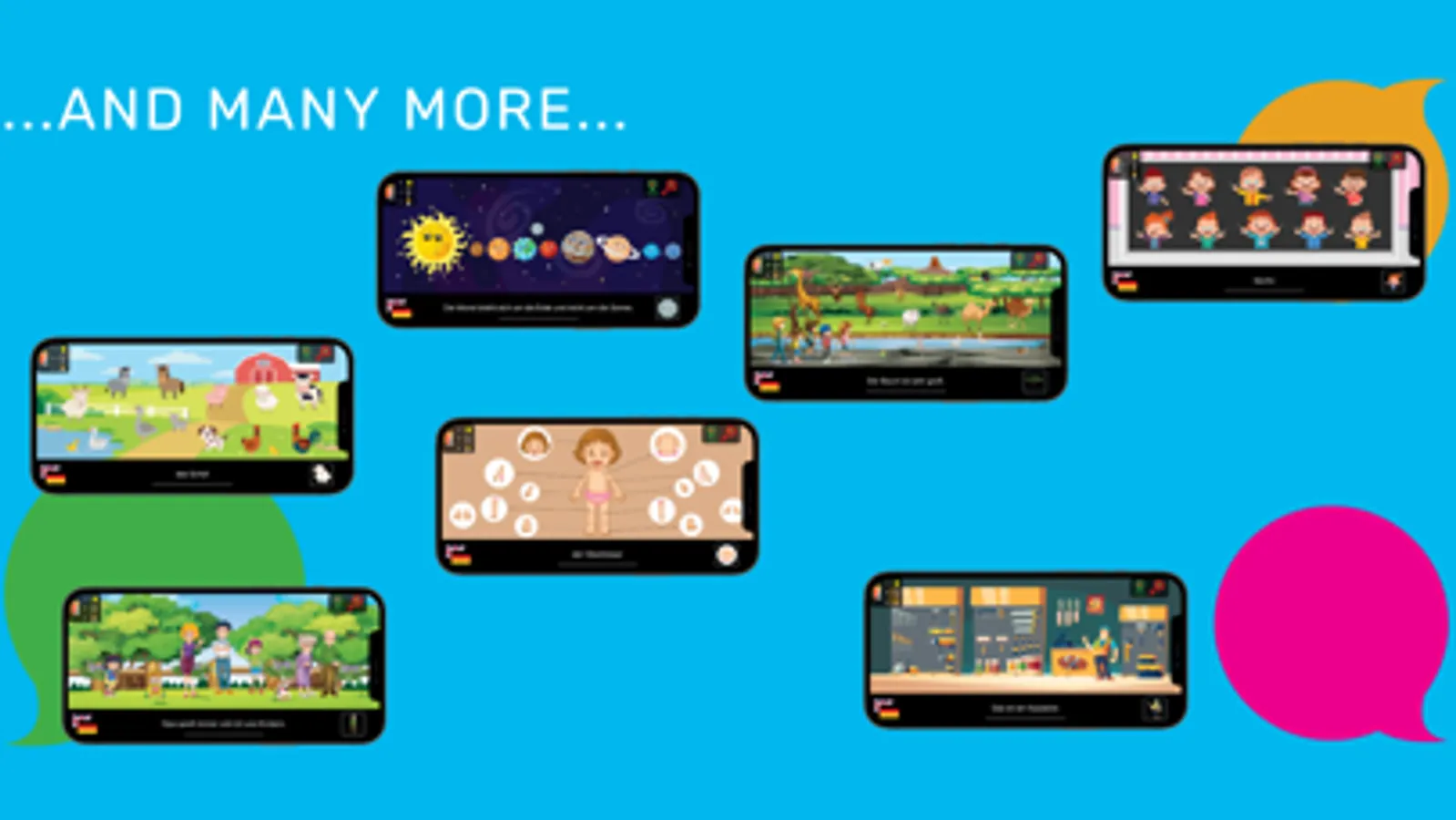 With over 14 chapters, more than 3000 words, sentences, and questions in 9 different languages, we are one of the largest multilingual children's learning apps in the world.