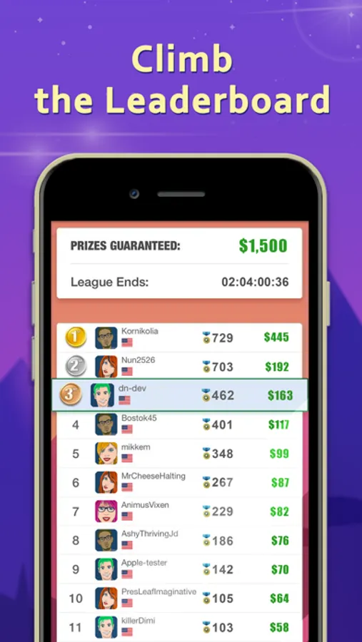 Compete with other Skillz players and with friends and win tournaments to rise up the ladder