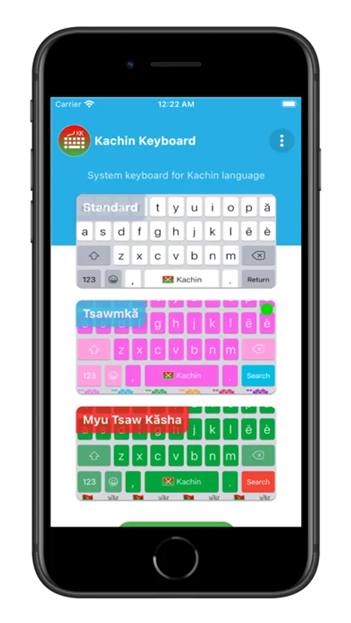 Kachin keyboard to write in the original Kachin written language introduced by Rev. Ola Hanson. Support iOS 10.0+, iPhone, iPod touch and iPad.