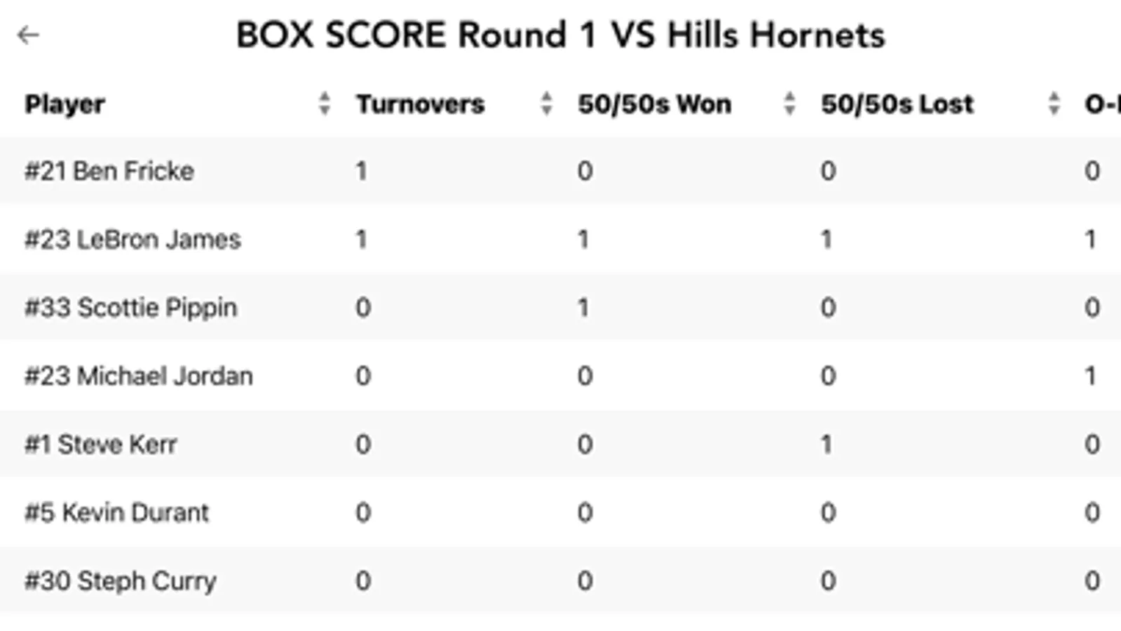 - Box Score (sortable list of each players stats)