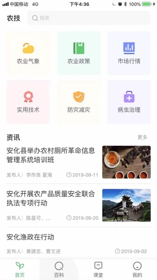 安化农技是安化黑茶农业综合服务平台。基于移动互联网技术、聚集各类农业科技教育资源,为农民用户提供在线学习、农业资讯、农技推广等综合农业服务。目前安化农技安化农技覆盖农技百科、农技课堂等多个板块。首页资讯板块,展现安化本地农业资讯信息。百科板块,展现安化各类涉农信息,包含气象、政策、行情等。课堂板块目前覆盖粮食种植、病虫害治理、肥料使用、水果种植等多个领域。