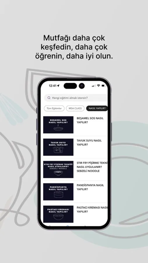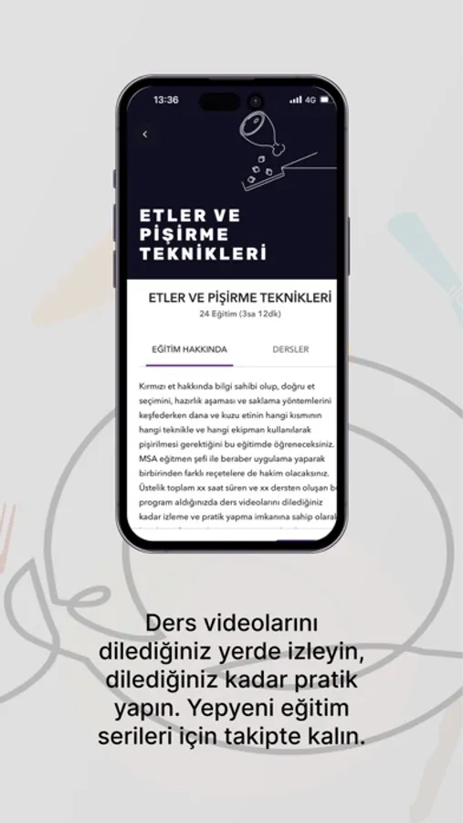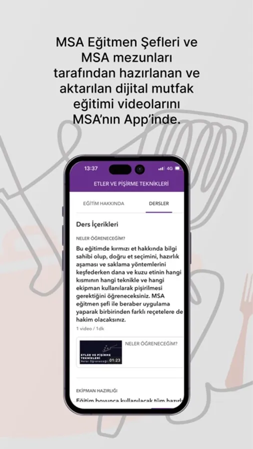 MSA Maslak kampüse erişemeyen, zaman kısıtı olan ve istediği zaman istediği kadar pratik yapma imkanına sahip olmak isteyen tüm mutfak severler için MSA Eğitmen Şefleri ve MSA mezunları tarafından hazırlanan ve aktarılan dijital mutfak eğitimi videoları MSA’nın App’inde.
