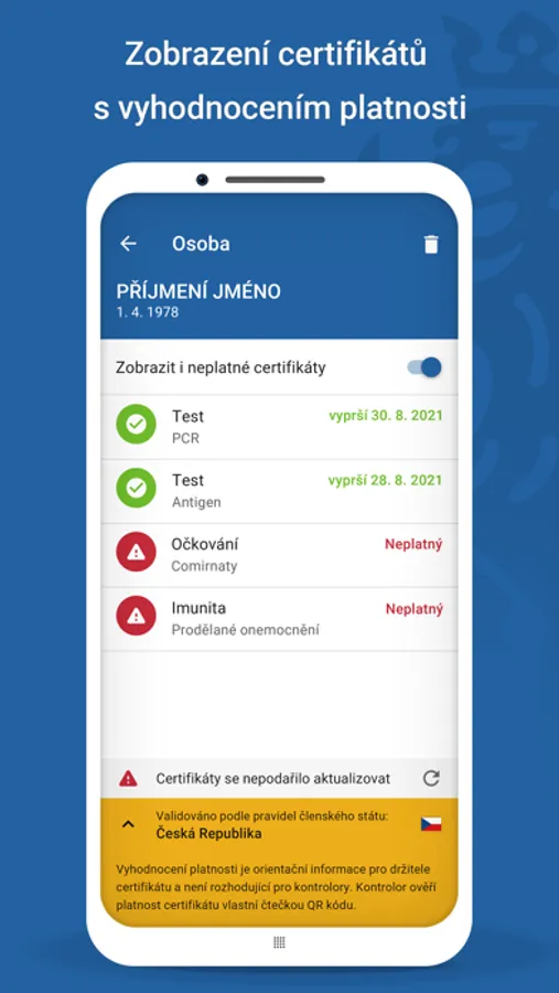 Digital COVID Certificate of the Czech Republic uses EU technical standards to prove health status related to COVID-19 (vaccination, recovery, test results) in compliance with EU regulation and Ministry of Health decrees.