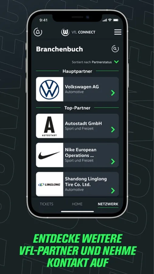 Zusätzlich bringt die App das Business-Netzwerk der VfL-Partner in eine digitale Umgebung und ermöglicht den Partnern des VfL Wolfsburg die Möglichkeit ihr Unternehmen in einem Branchenbuch zu präsentieren und mit anderen Business-Partnern in Kontakt zu treten.