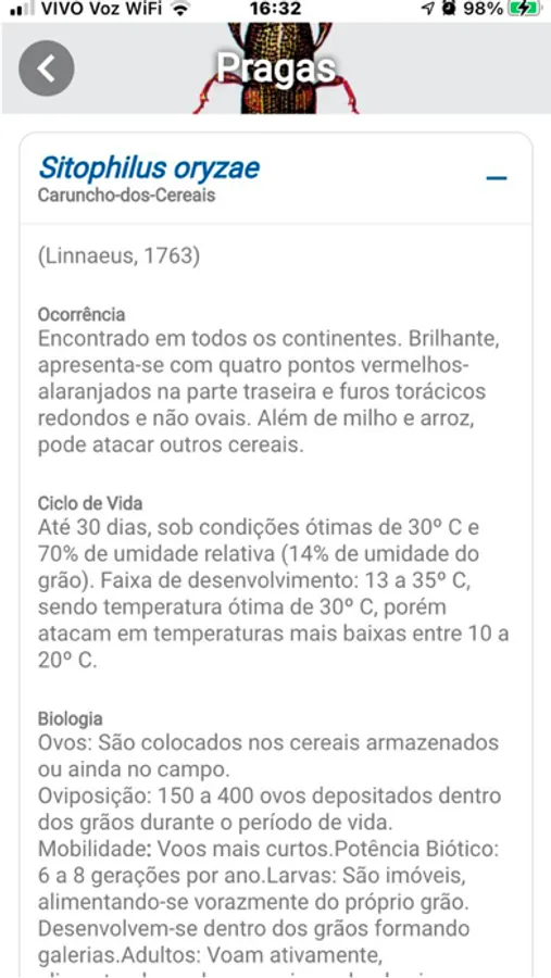 - Biologia das principais pragas de grãos armazenados.