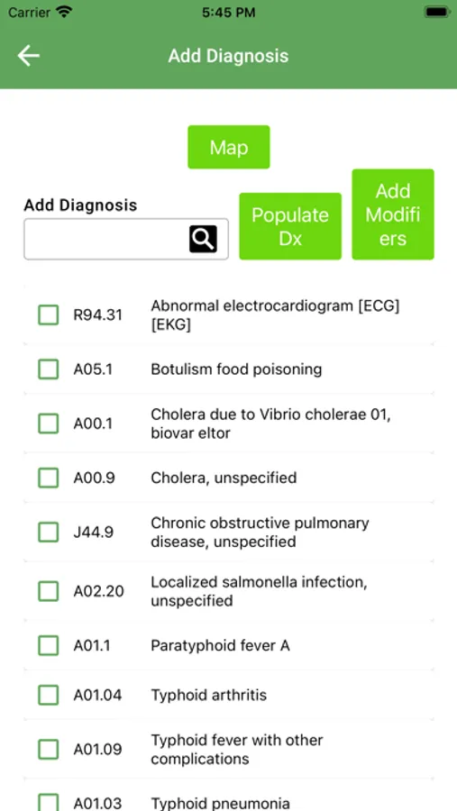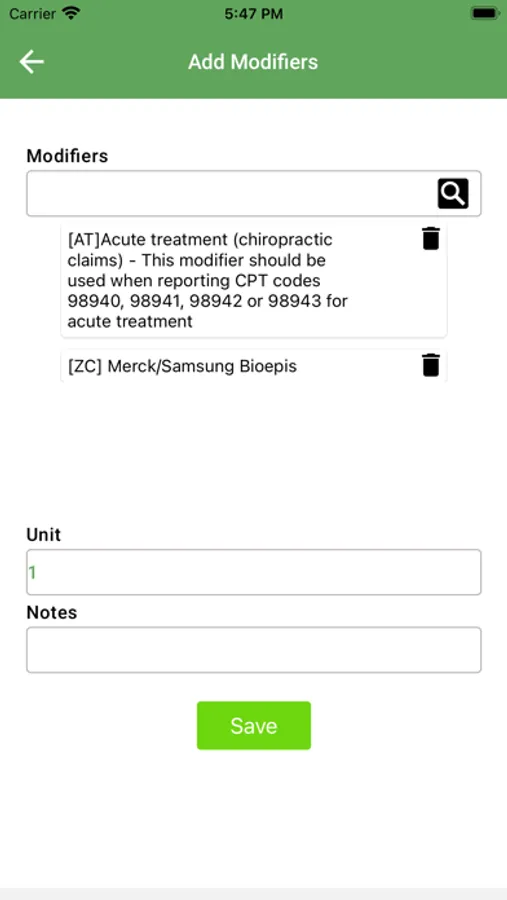 In case of missing procedures or diagnosis codes on Electronic superbill form, provider always can add them through superbill settings. During creating electronic superbill providers can add additionally (to procedures) modifiers, units, make notes, add patient authorization and eventually submit the electronic superbill.