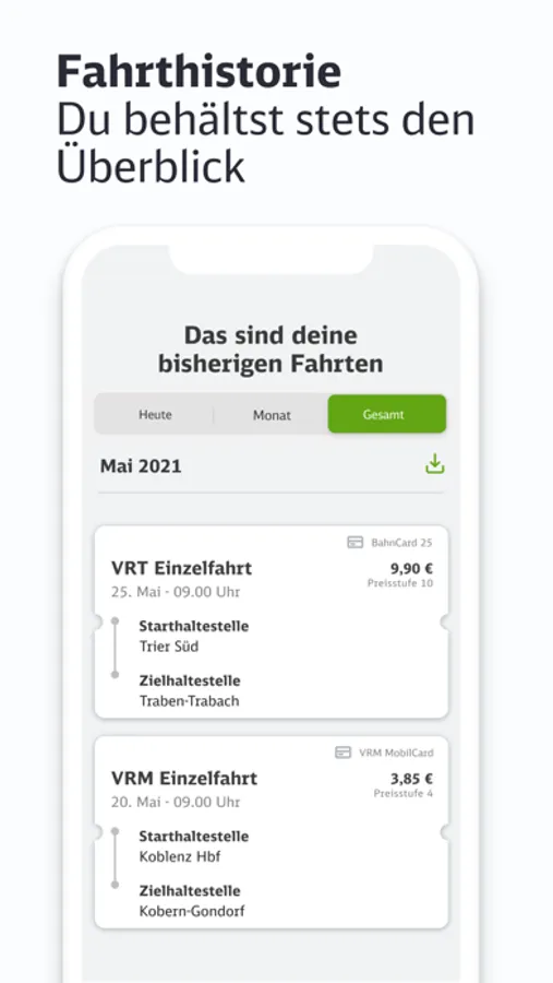 In der Fahrthistorie behältst du immer den Durchblick! Alle Fahrten, alle Preise und direkter Zugriff auf den Kaufbeleg. Praktisch, oder?