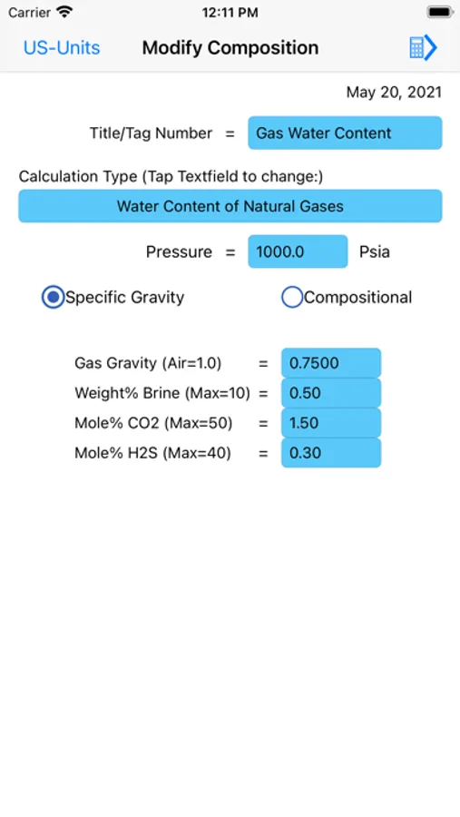 Water content calculations are based on a method developed by Campbell. The method applies the standard physical chemistry equations and the Eykman Molecular Refraction (EMR) combination rules. For water content calculations the approach here uses fugacity coefficient as one of the key factors.