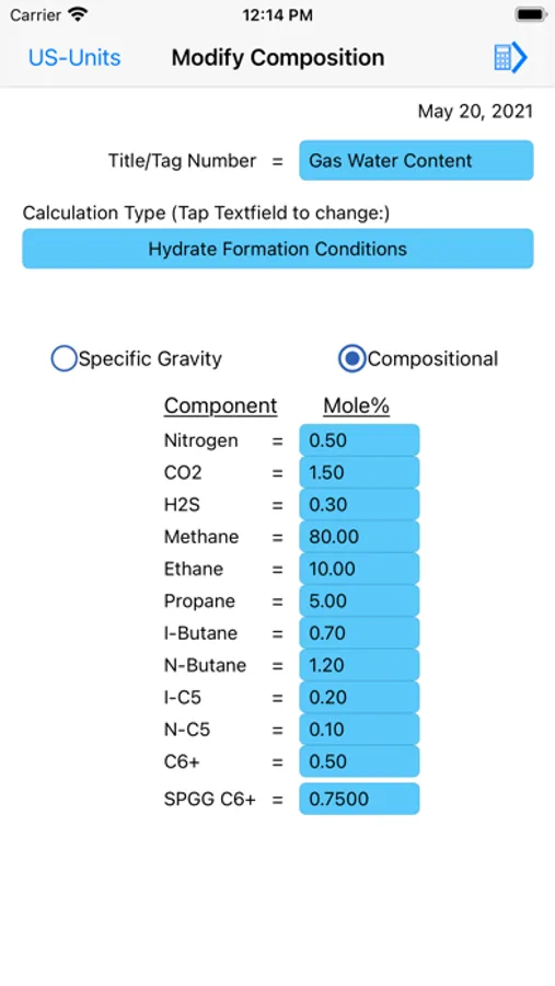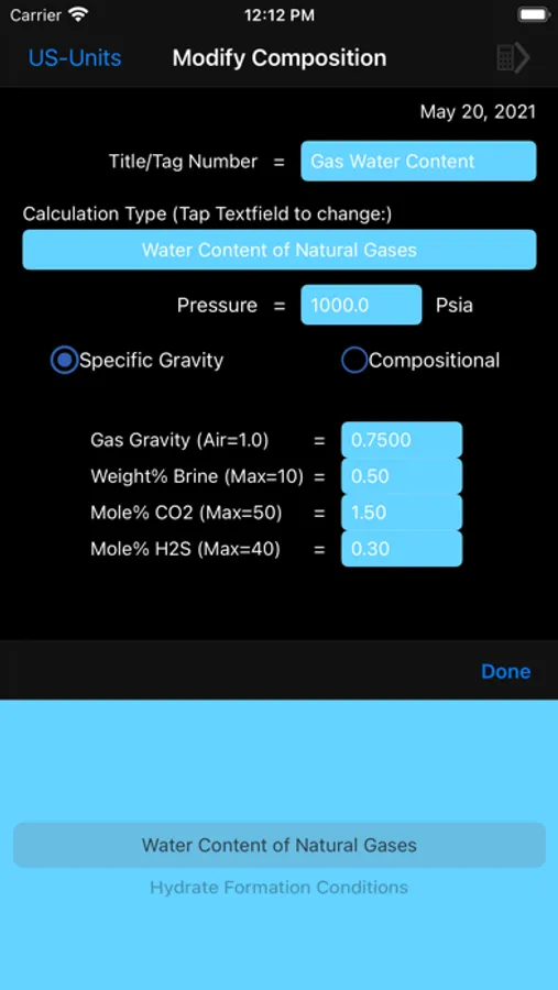 In this app the hydrate calculations are based on Katz' method for predicting hydrate conditions. Empirically determined vapor-solid equilibrium constants are utilized in predicting hydrate formation conditions.