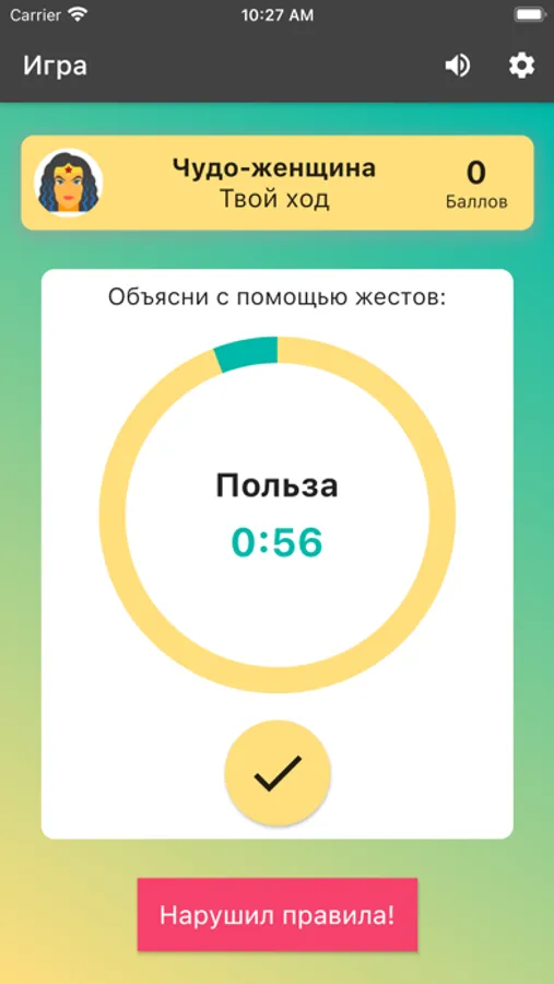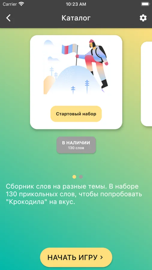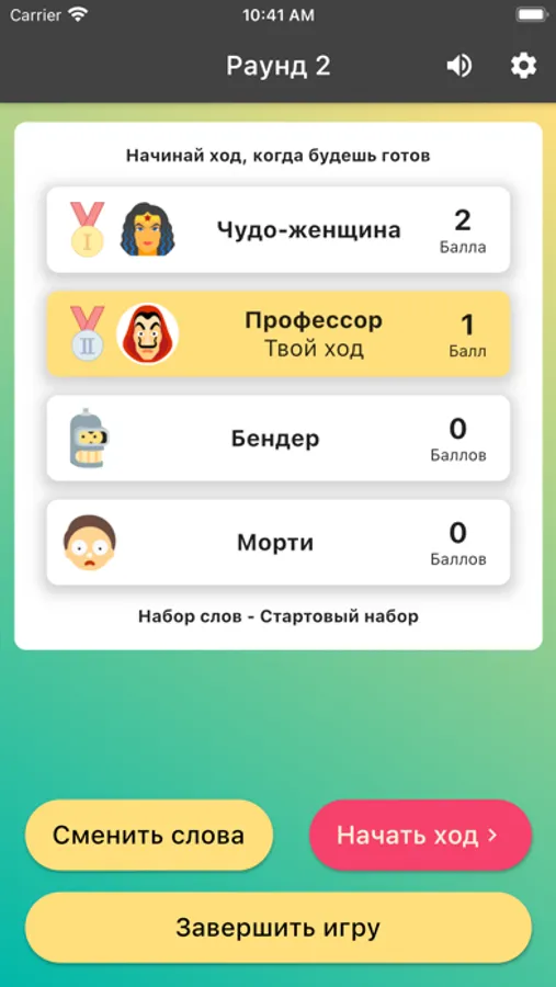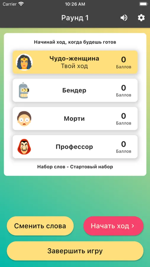 Выбери персонажа, набор слов из каталога и покажи своим товарищам выпавшее слово с помощью мимики, жестов и танцев, не издав ни единого звука.