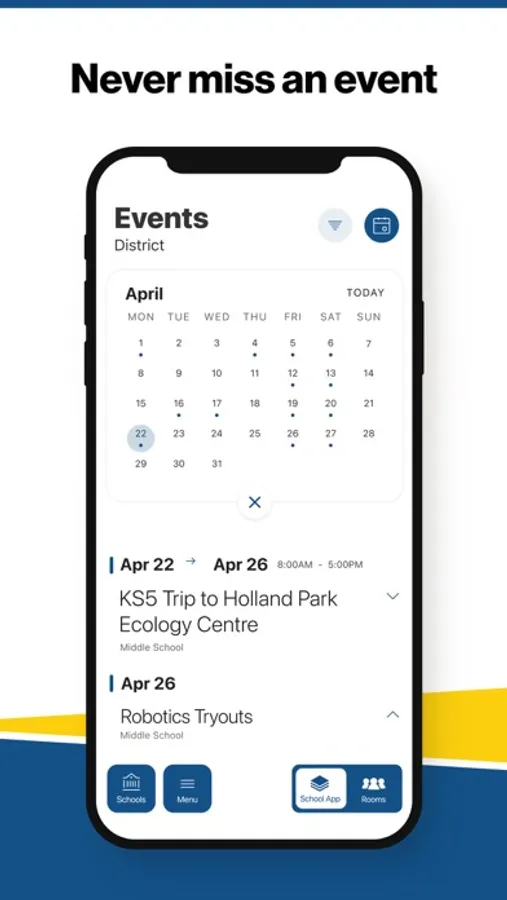 The event section shows a list of events throughout the district. Users can add an event to your calendar to share the event with friends and family with one tap.