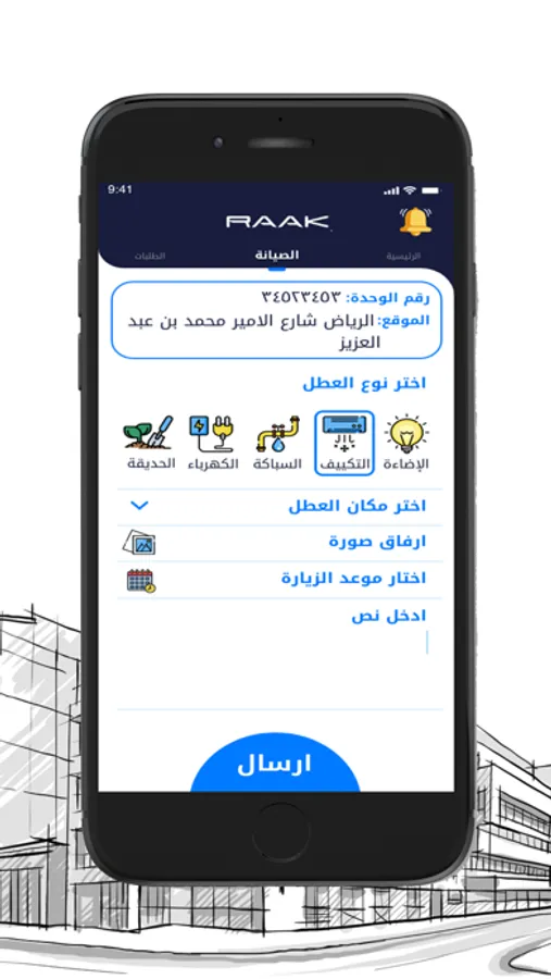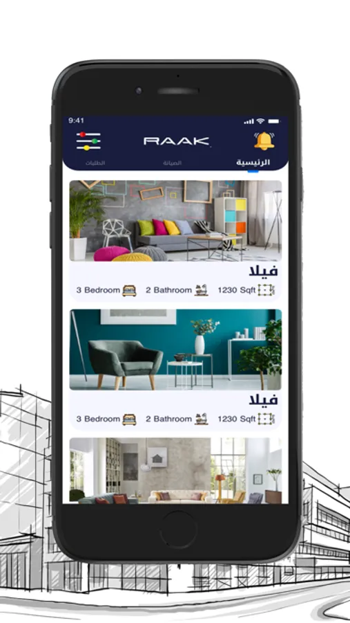 The RAAK application is owned by RAAK Real Estate Company, based in the Kingdom of Saudi Arabia. It is an application that facilitates services and preferences for villa owners from the company and enables the owner to request maintenance for all home faults, including electricity, plumbing, and others.