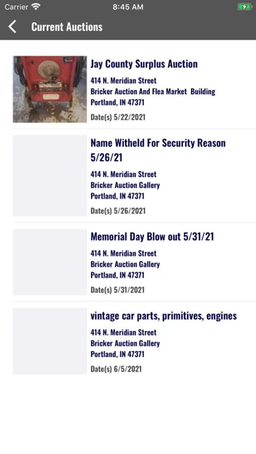 We offer both online and simulated auctions. We have an auction house located at 414 N. Meridian St. Portland, IN.